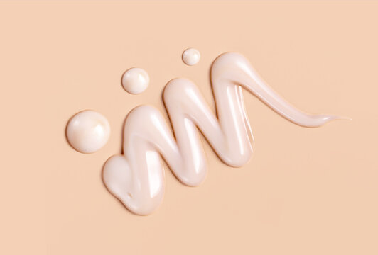 Closeup photography of beauty blender with dripping bronzer on it.Neutral beige background,large banner with copy space.