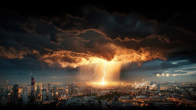 An expansive view of a summer thunderstorm with dark, brooding clouds dominating the horizon. Flashing lightning dramatically illuminates the city below.