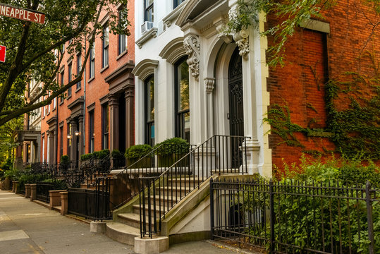 Brownstone facades & row houses at sunset in an iconic neighborhood of Brooklyn Heights in New York City