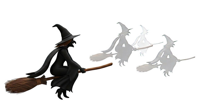 Silhouette of a witch flying on broomstick with trail of stars white background