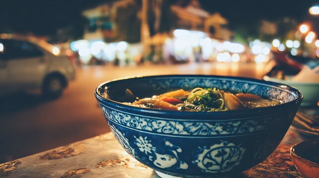 Close Up of Blue and White Bowl with Brothy Soup Illuminated by Soft Bokeh Lights on Textured Tablecloth at Night