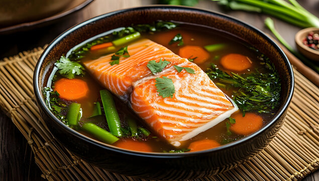 Salmon fillet with vegetables in a brothy soup served in a traditional bowl on bamboo mat decorated with herbs and condiments