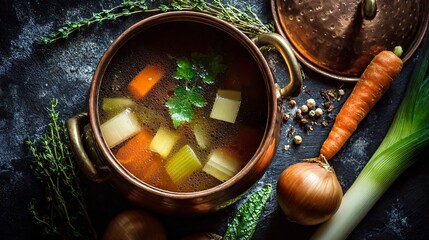 Brothy vegetable soup in vintage copper pot, ingredients laid around, such as carrot, parsnip and leek, overhead shot on slate-gray countertop with soft shadows