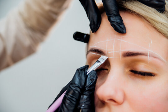 Professional cosmetologist hands are doing permanent makeup on eyebrows of young woman, close up.