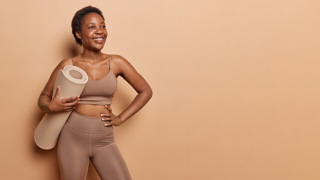 Horizontal shot of slim African woman carries rolled karemat under arm smiles gladfuly ready for yoga practice dressed in activewear poses against brown background copy space for your promotion