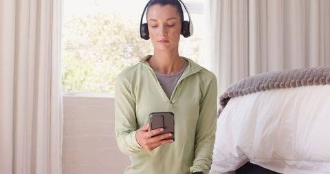 Woman in activewear with headphones using smartphone at home