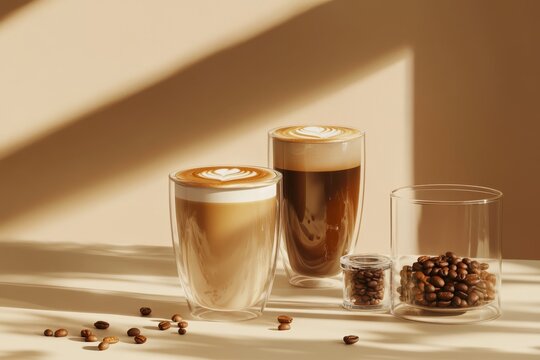 Two Latte Art Coffee Drinks in Double-Wall Glasses