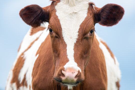 Curious white-and-brown cow staring with hay in mouth rustic barn close-up portrait