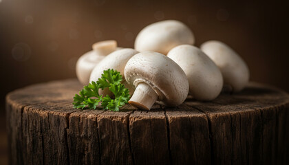 Two white button mushrooms, showcasing their smooth, rounded caps and slender stems, set against a soft, neutral backdrop