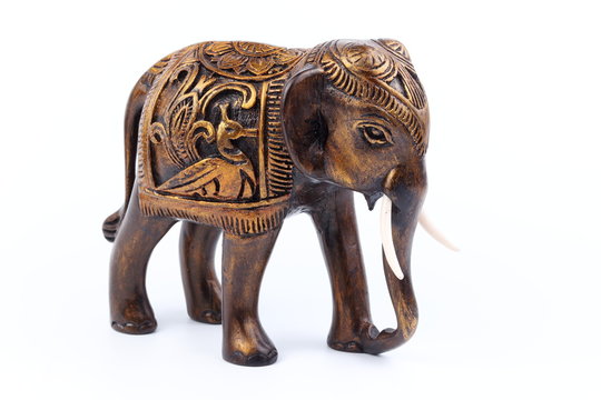 gold and brown elephant made of resin like wood carving with candle holder with white sesame. Stand on white background, Isolated, Art Model Thai Crafts, For decoration Like in the spa.