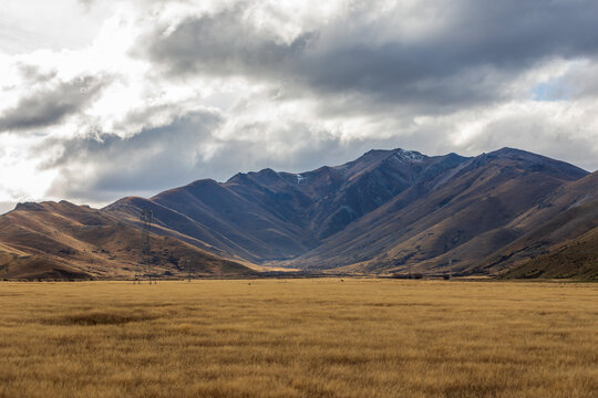 Photograph of a dry mountain range running behind a large brown agricultural field with low level grey clouds on the South Island of New Zealand