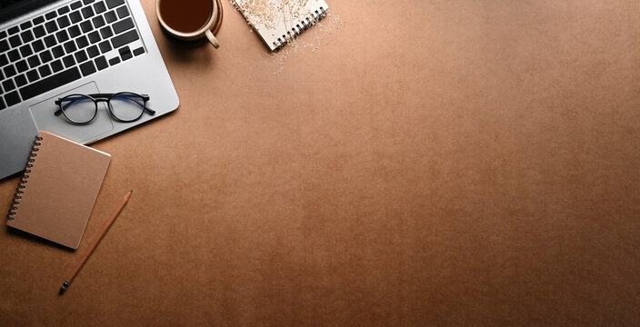 Computer laptop, glasses, coffee cup and notepad on brown background. Top view.
