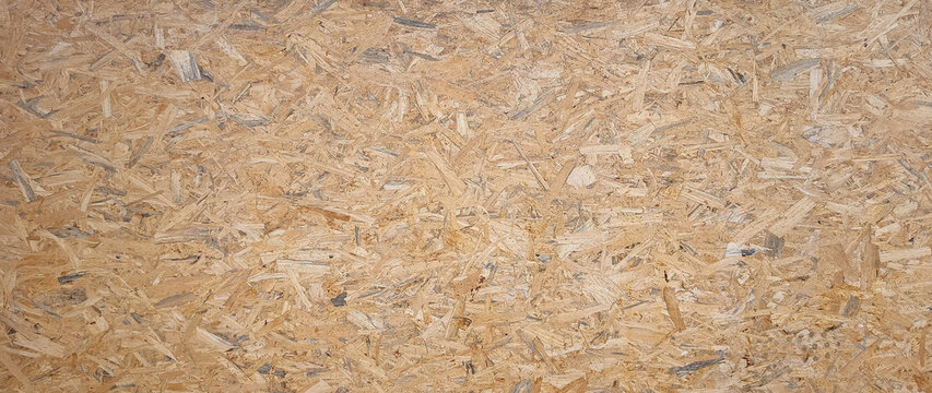 Panorama of pressed wooden panel background - texture of oriented strand board - OSB wood texture