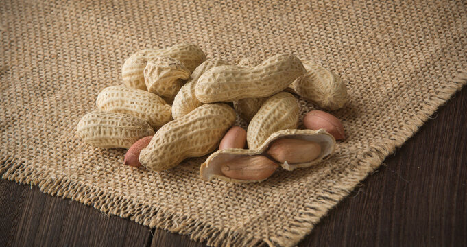 Roasted peanuts in wooden bowl putting on linen and wooden background.
