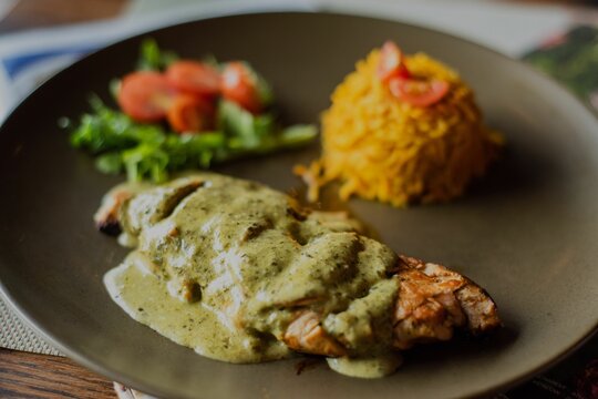 Close-up of a dinner served on a brown plate - restaurant dish concept