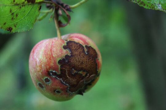 Big Brown spot on red apples on branch in the orchard. Diseased apple tree. Malus domestica