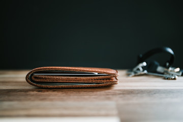 Brown leather wallet and keys on a wooden table with black background.