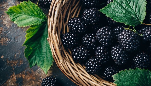 Close-up of Fresh Blackberries in a Wicker Basket with Green Leaves