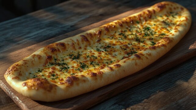 Delicious cheese pide with fresh herbs on wooden board ready to serve