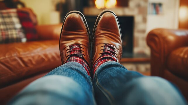 Relaxed Feet in Stylish Brown Leather Shoes and Colorful Socks Resting on Couch in Cozy Living Room Atmosphere