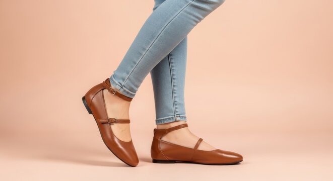 Legs wearing blue jeans and brown Mary Jane flat shoes. One foot is raised, showing the comfortable and classic strap design.