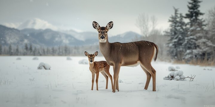 Deer family in snowy woodland setting along a wildlife route, highlighting habitat conservation