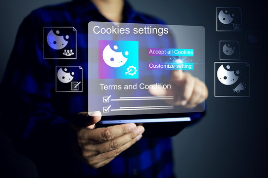 Illustration of person using finger to tap search bar on smartphone screen with floating digital icons representing various online services or applications in a modern setting