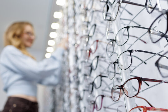 Woman browsing colorful clothes on clothing rack in sunlit store