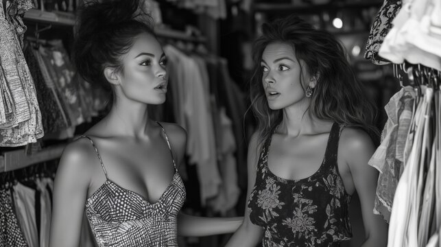 Friends discuss styles while browsing clothes in a trendy boutique together
