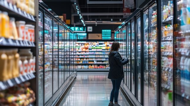 In a supermarket aisle, a woman in a cozy sweater examines personal care products on the shelves, thoughtfully choosing items that catch her interest.