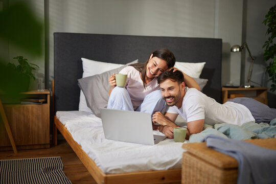 A couple sits together on their bed, smiling and browsing vacation options on a laptop. They hold mugs, enjoying their relaxed atmosphere while planning their upcoming getaway.