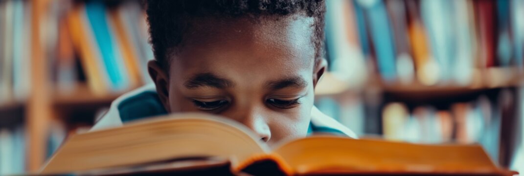 Young man reading book in quiet library during afternoon study session