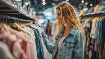 Blonde stylish woman stands in a fashion store, carefully choosing fashion clothing items to buy. She browses through racks of stylish clothes, examining each one closely before making a decision