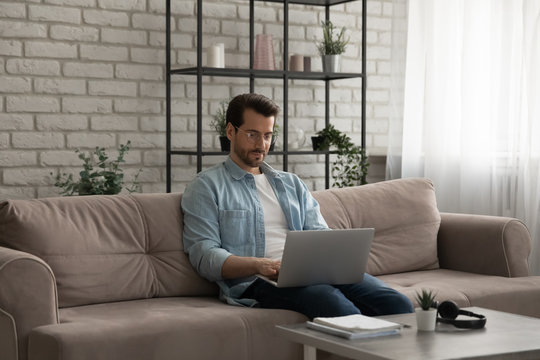 Young caucasian man in glasses sit on couch in living room work on laptop browsing internet, millennial male look at computer screen, consult client or freelance in home office, technology concept