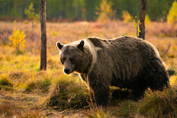 Brown bear - close encounter with a  wild brown bear eating in the forest and mountains of the Notranjska region in Slovenia