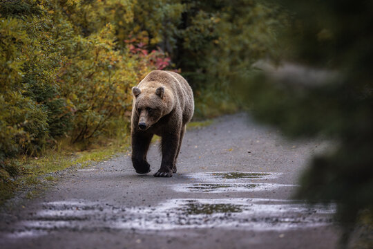 Brown Bear Katmai Brooks Falls Brooks River Fall Autumn walking on road