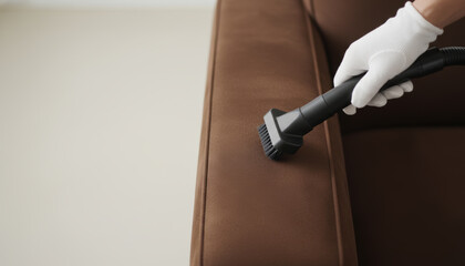 Professional domestic cleaning of a brown sofa and upholstery couch furniture using a vacuum brush attachment held by a hand in a white glove for hygiene maintenance and dust removal.