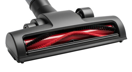 A black vacuum cleaner head with a red bristle attachment, isolated on a white background.