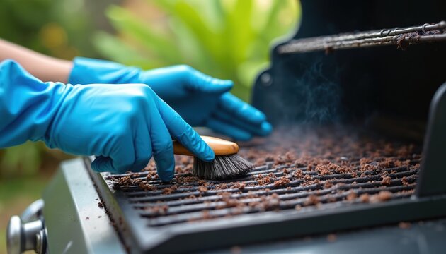 Hands in blue gloves cleaning barbecue grill with brush outdoors. Person removes food residue from grill grates in garden or backyard. Maintenance and hygiene for outdoor cooking.