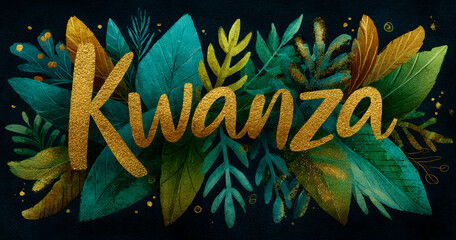 Golden kwanzaa script with multicolor confetti and sparkling festive typography
