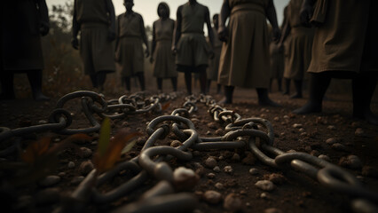 A recreation of slavery with chains and cotton fields, symbolizing the brutality and historical impact of slavery.