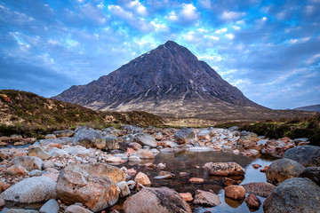 Scenic view of Buachaille Etive Mor in Glen Coe, Scotland, with a small waterfall flowing over rocks on a clear day. Natural landscape, mountain scenery and freshwater stream.