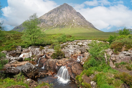 Buachaille Etive Mor, and River Coupall waterfalls, the Glencoe area of Scotland, UK.