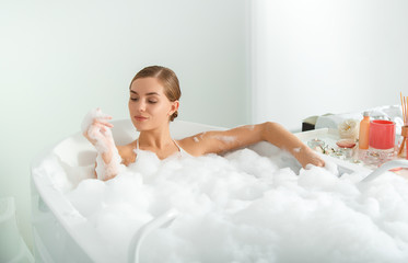 Beautiful woman enjoying bubble bath at home