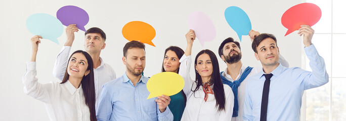 Diverse group of business people holding bright color empty paper speech bubble, representing talk, chain thought bubble thinking dialogue balloon, free idea suggestion, plan, sharing opinion, belief