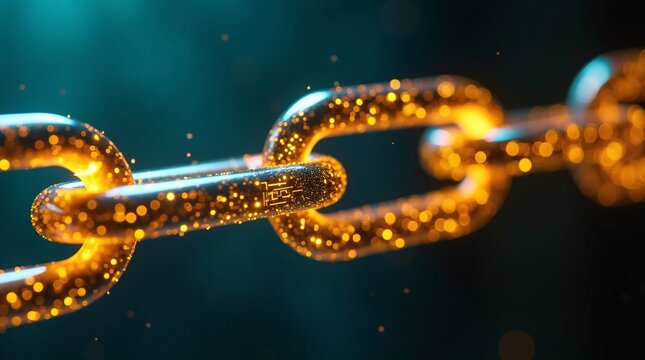 A glowing, metallic chain (golden-orange) with embedded circuit patterns shimmers against a dark teal background.