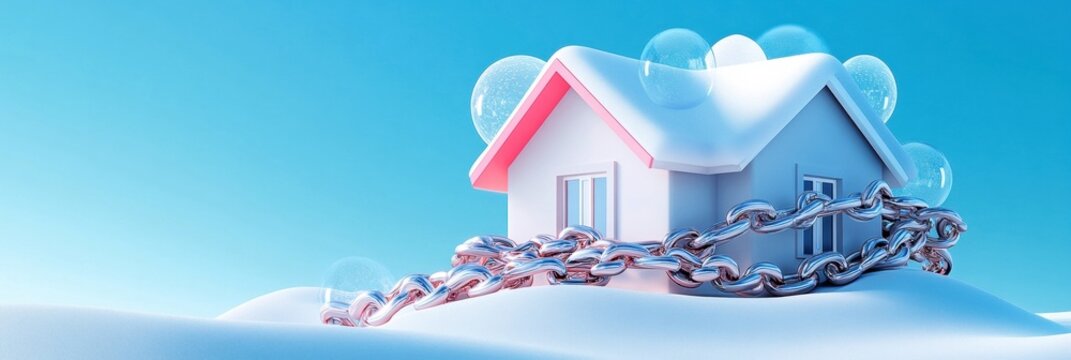 A whimsical house surrounded by bubbles and chained in a snowy landscape.