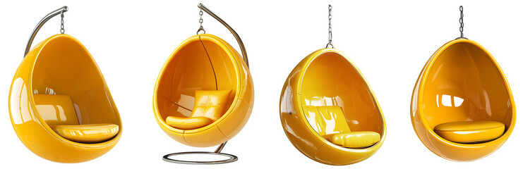 Modern yellow hanging bubble chairs with metal stands and chains transparent background