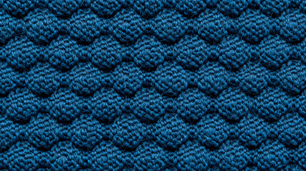 Close-up of a textured blue knitted fabric featuring a repeating bubble pattern with a rich, cozy appearance.