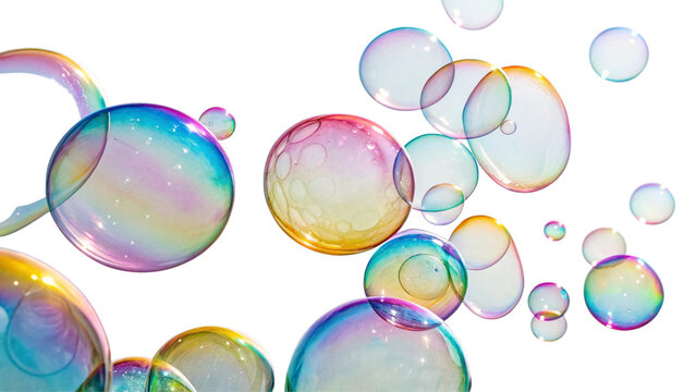 Collection of transparent soap bubbles with soft reflections gently floating on a clean white background